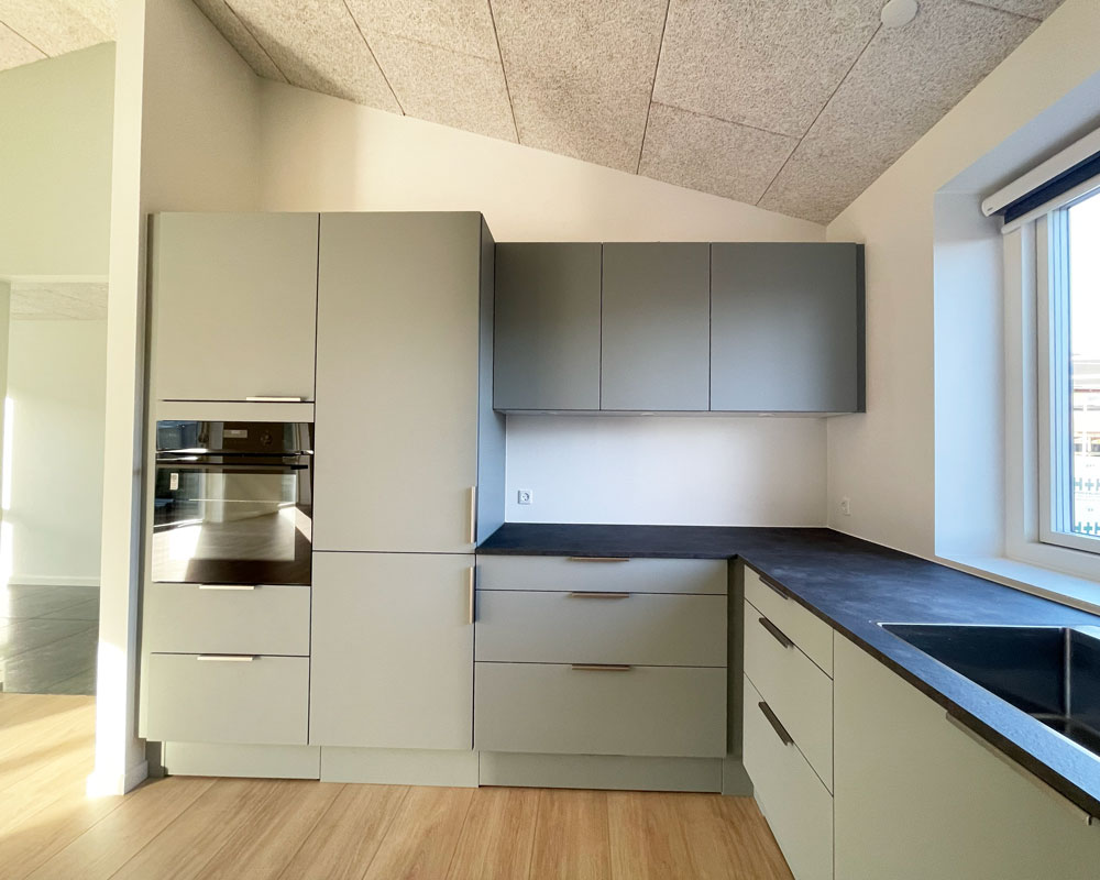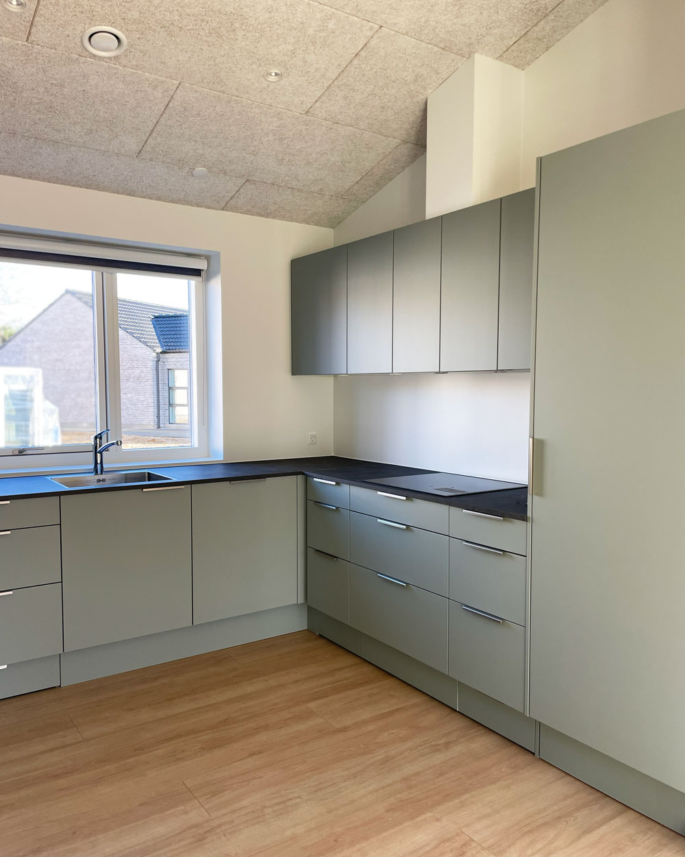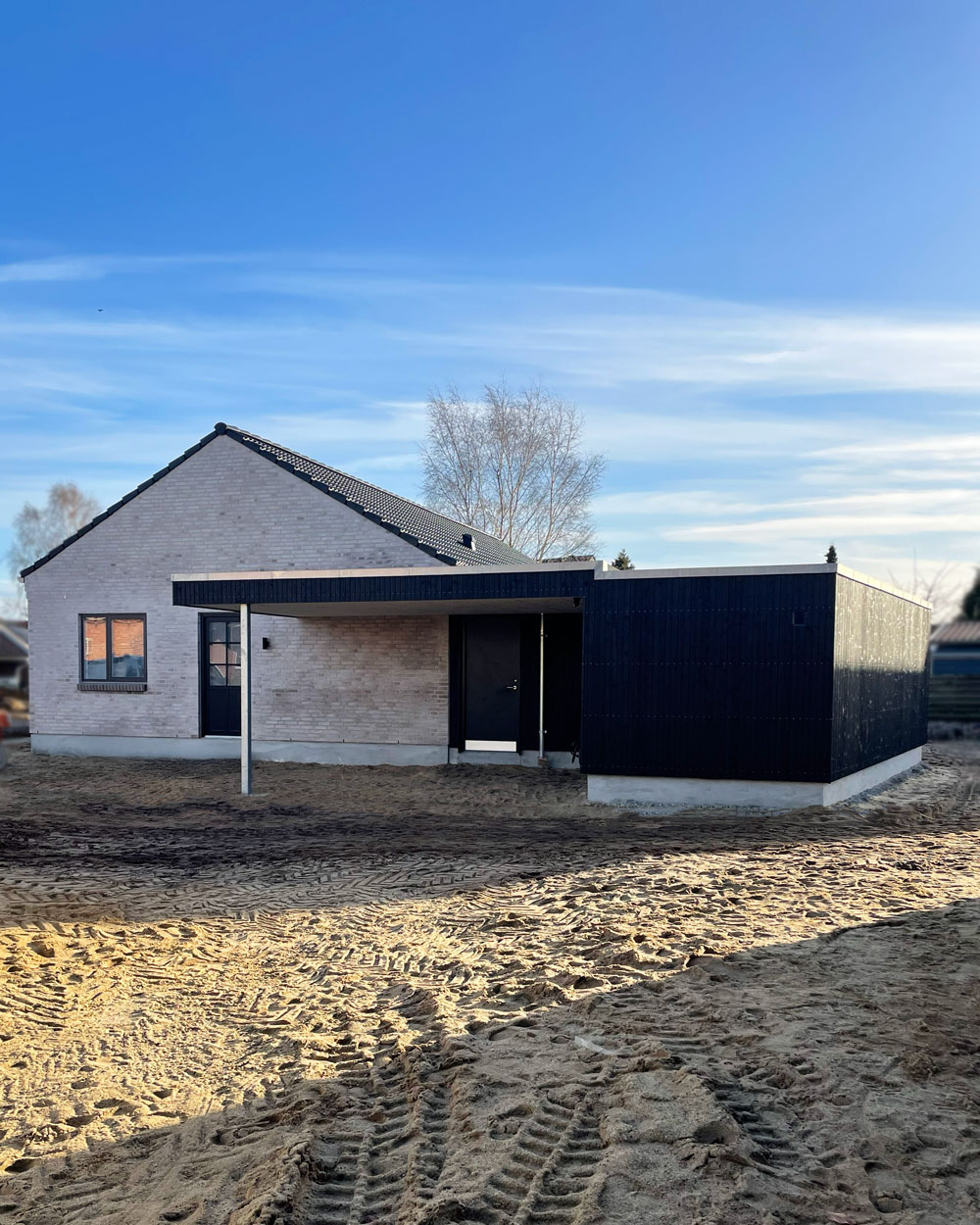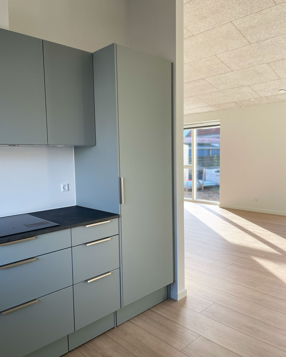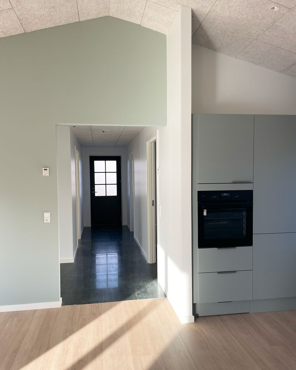 Vi har afleveret et 130 m² længehus til Lotte og Jan på Grøndalsvej i Silkeborg. Huset har en overdækket udendørs terrasse med lys træbeklædning, der skaber en naturlig og hyggekrog i haven. Inde i boligen går de douce grønne skabselementer igen på værelser, badeværelse og i køkkenet, hvor udtrykket samler hele hjemmet. Bryggers, gang og badeværelse er udført med eksklusive grønne klinker med flot farvespil. Udenfor fuldendes boligen af en udvidet carport med ladestander.