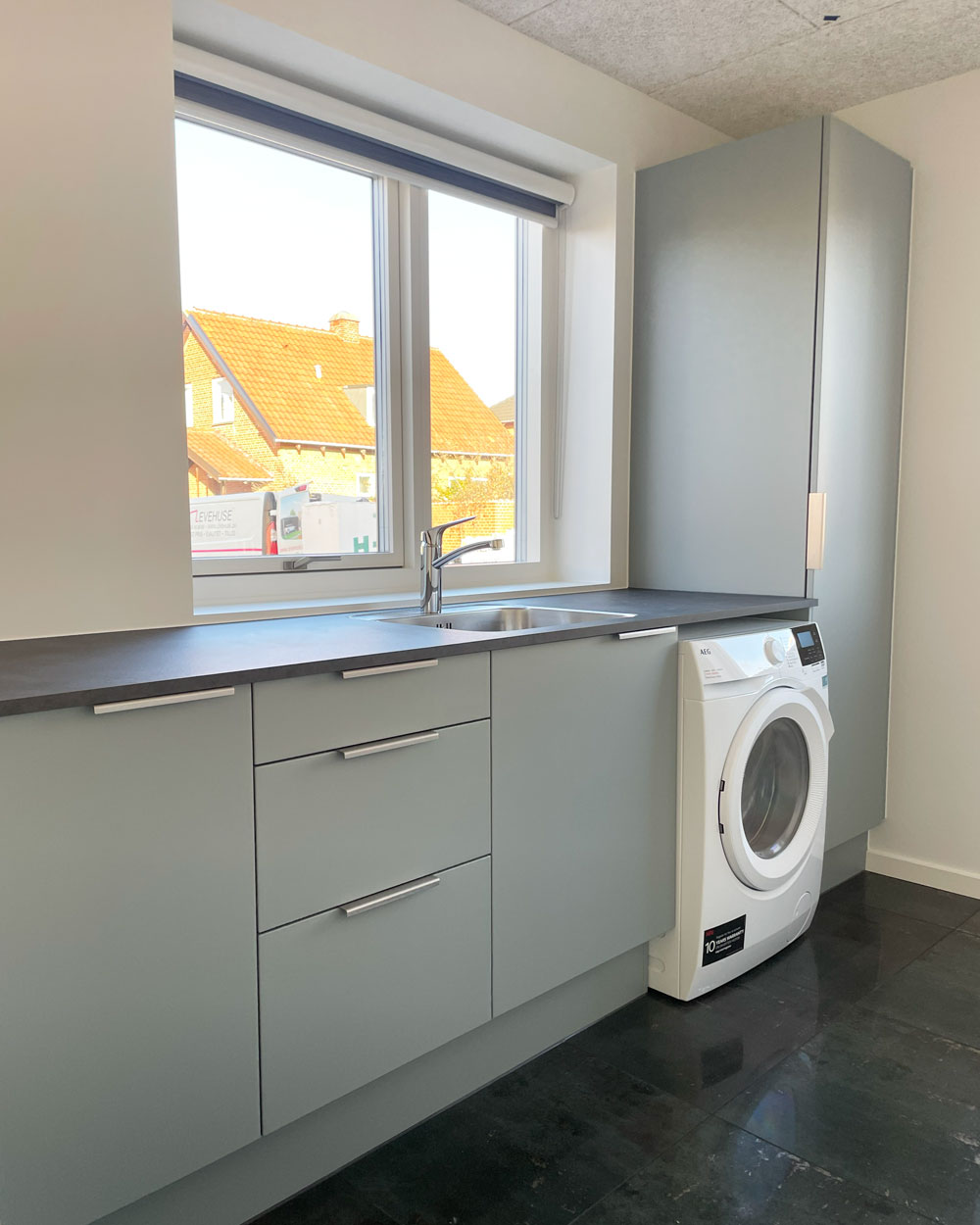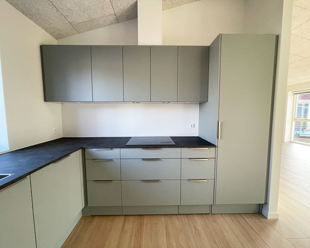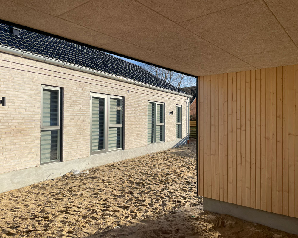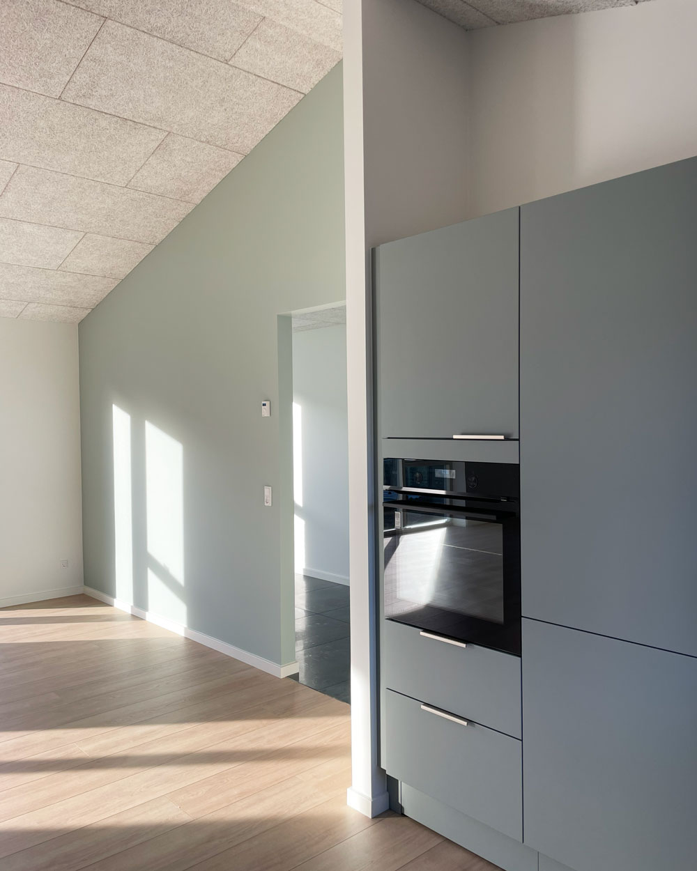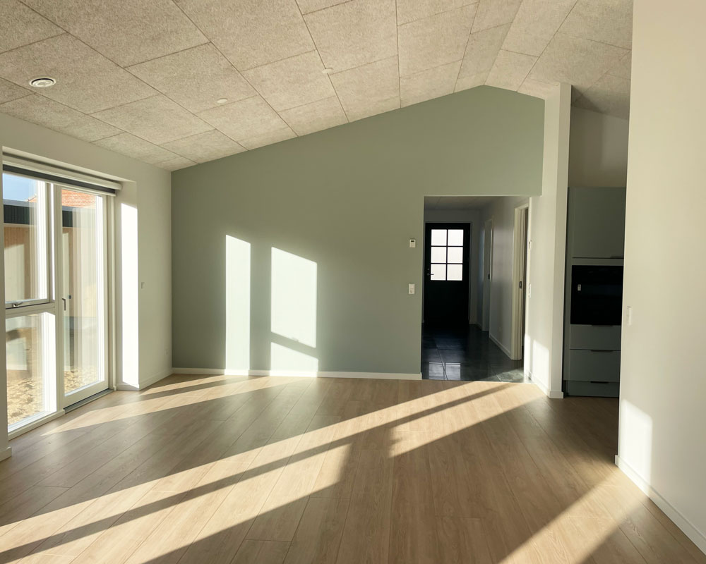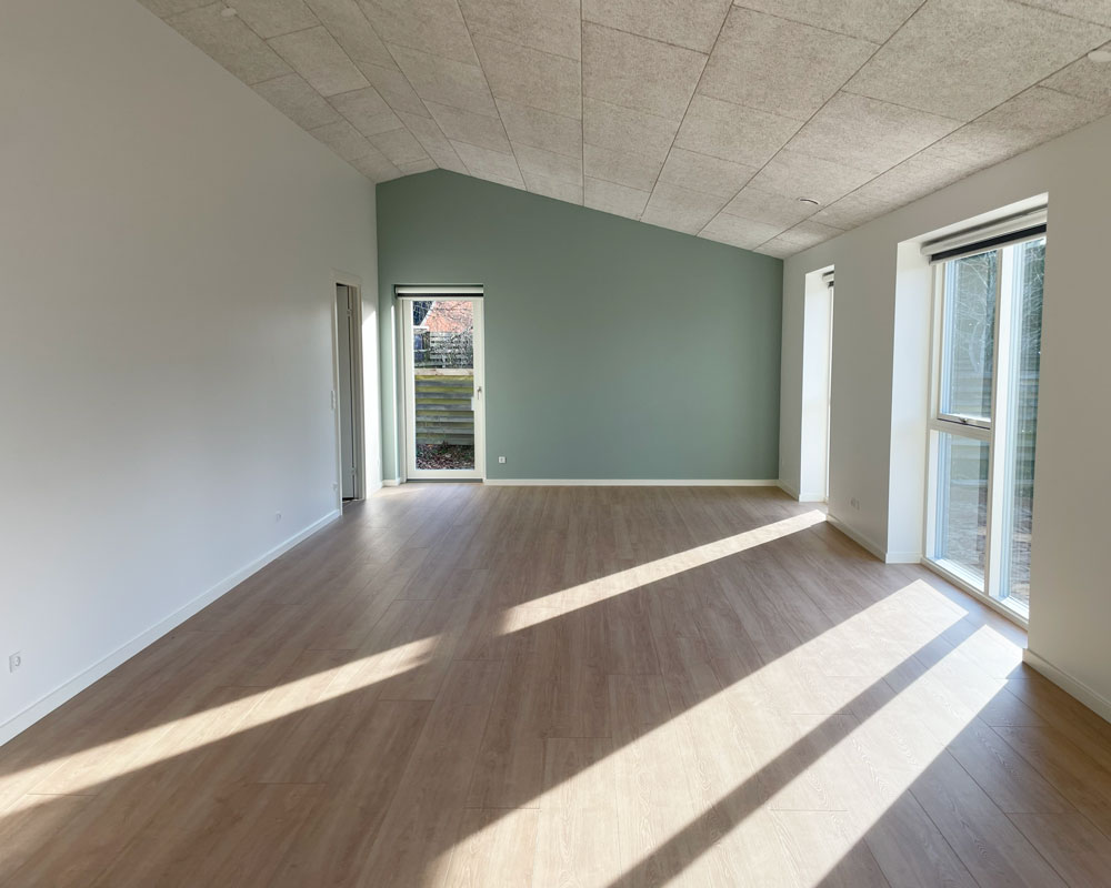 Vi har afleveret et 130 m² længehus til Lotte og Jan på Grøndalsvej i Silkeborg. Huset har en overdækket udendørs terrasse med lys træbeklædning, der skaber en naturlig og hyggekrog i haven. Inde i boligen går de douce grønne skabselementer igen på værelser, badeværelse og i køkkenet, hvor udtrykket samler hele hjemmet. Bryggers, gang og badeværelse er udført med eksklusive grønne klinker med flot farvespil. Udenfor fuldendes boligen af en udvidet carport med ladestander.