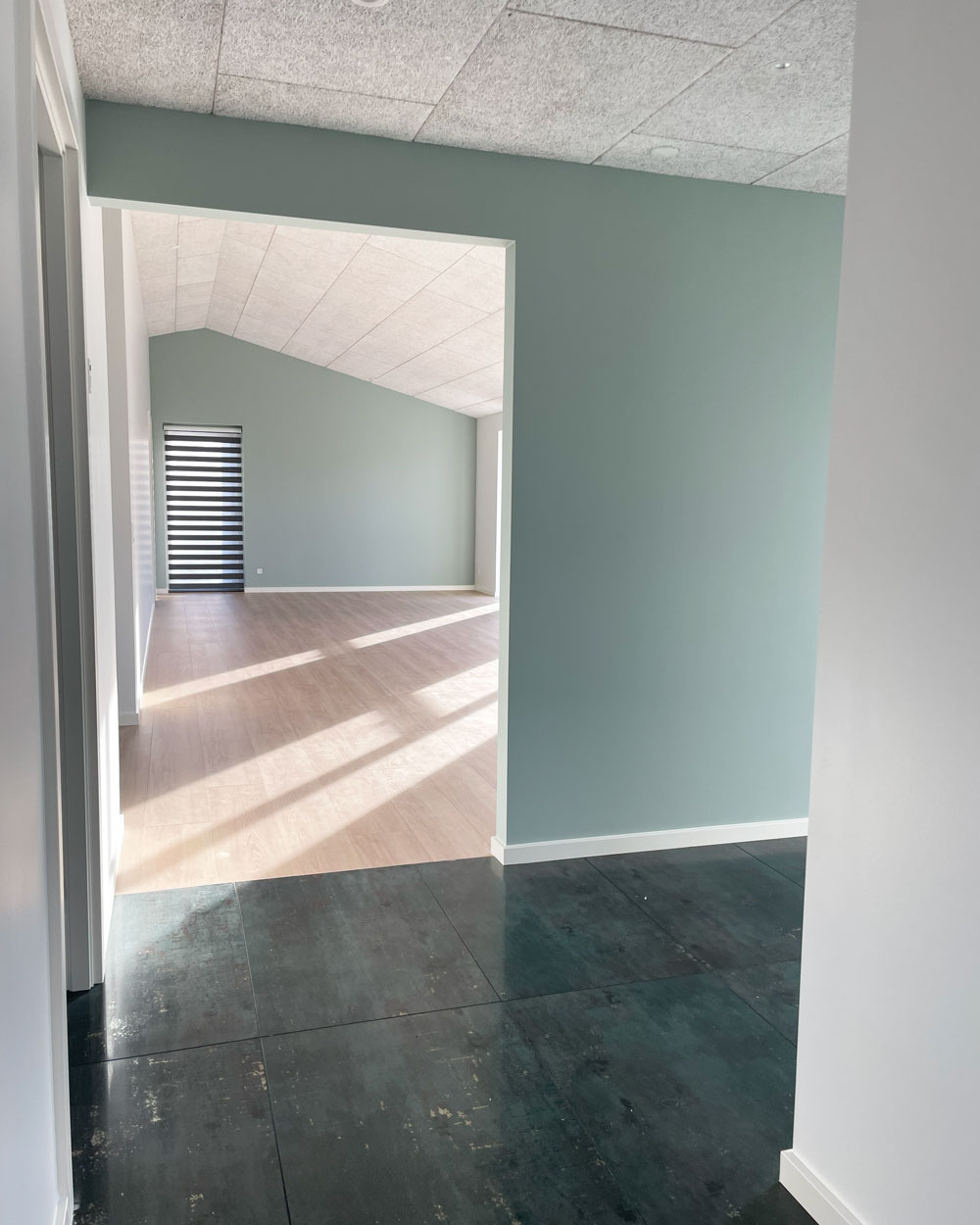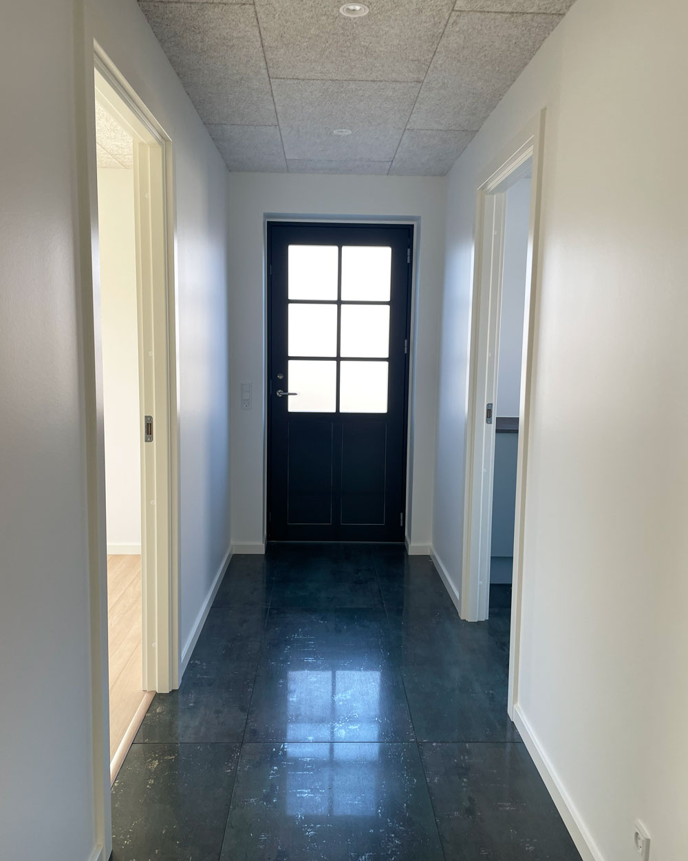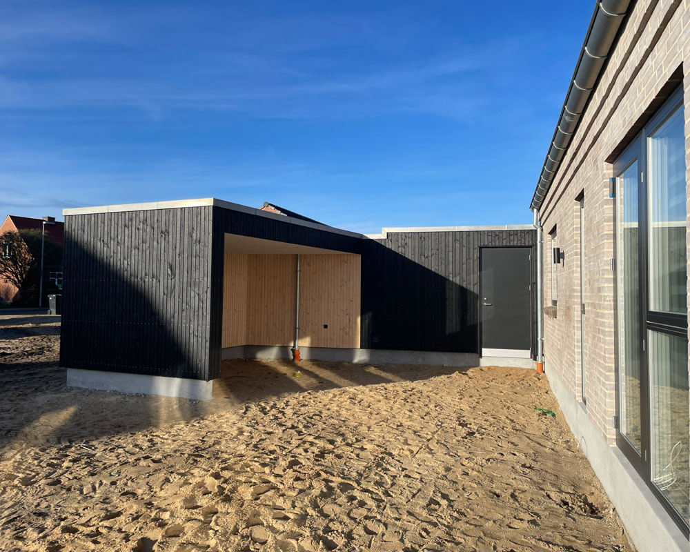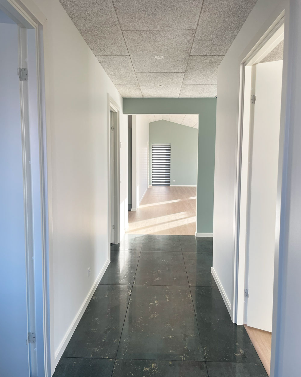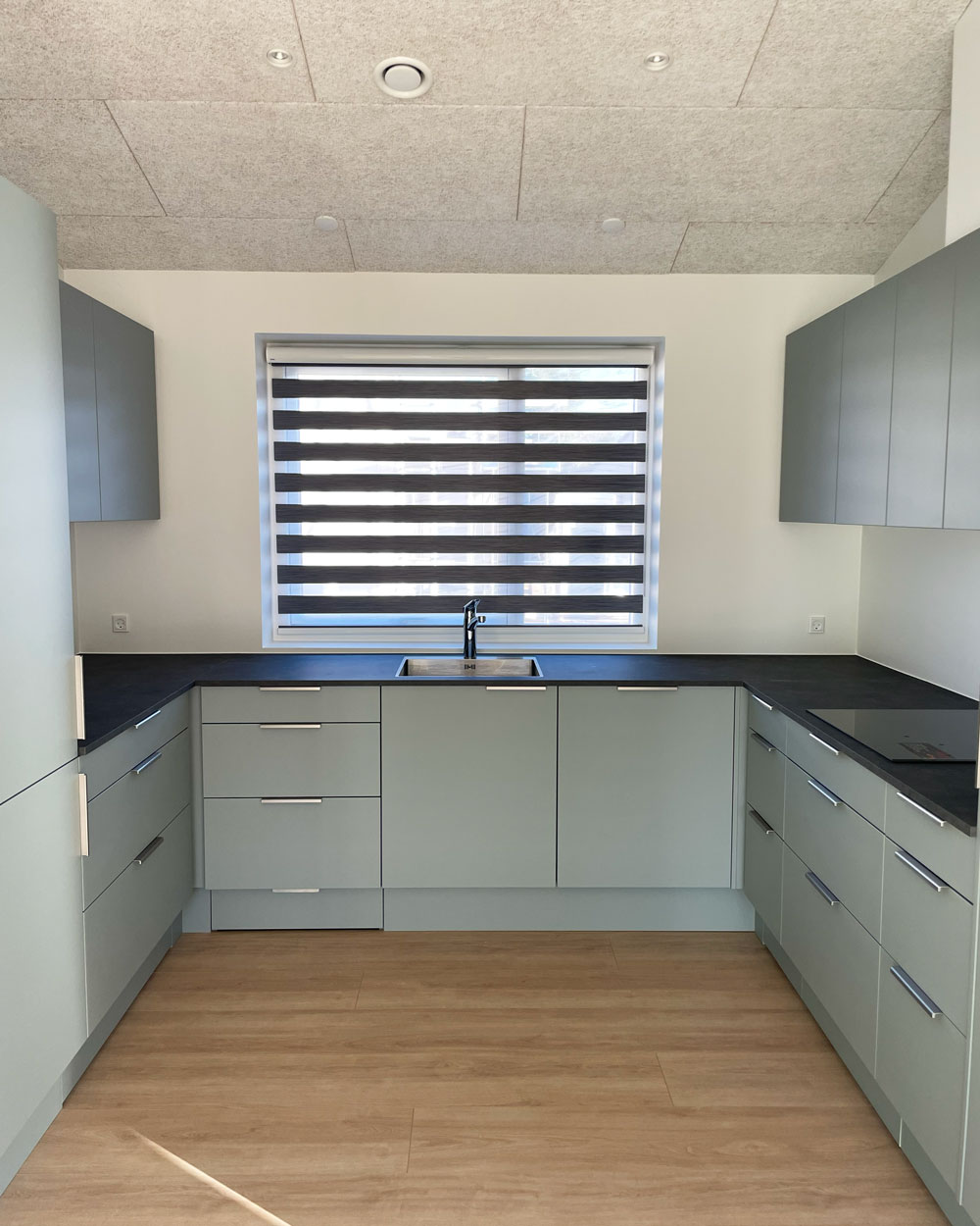 Vi har afleveret et 130 m² længehus til Lotte og Jan på Grøndalsvej i Silkeborg. Huset har en overdækket udendørs terrasse med lys træbeklædning, der skaber en naturlig og hyggekrog i haven. Inde i boligen går de douce grønne skabselementer igen på værelser, badeværelse og i køkkenet, hvor udtrykket samler hele hjemmet. Bryggers, gang og badeværelse er udført med eksklusive grønne klinker med flot farvespil. Udenfor fuldendes boligen af en udvidet carport med ladestander.