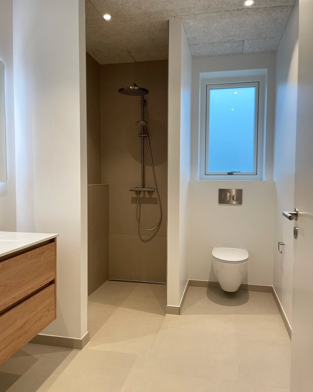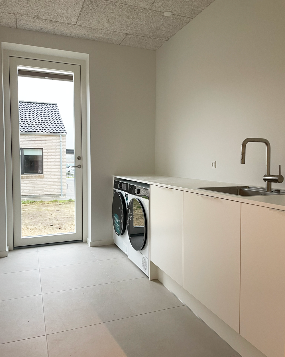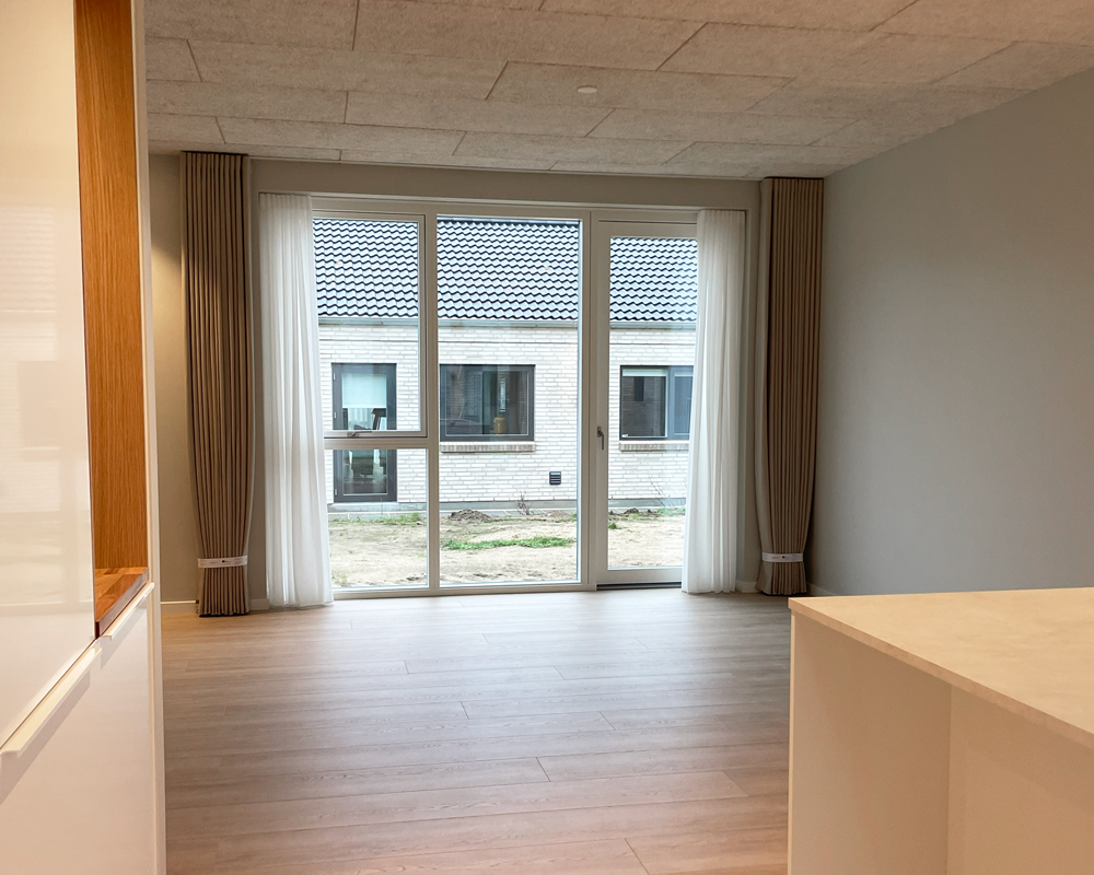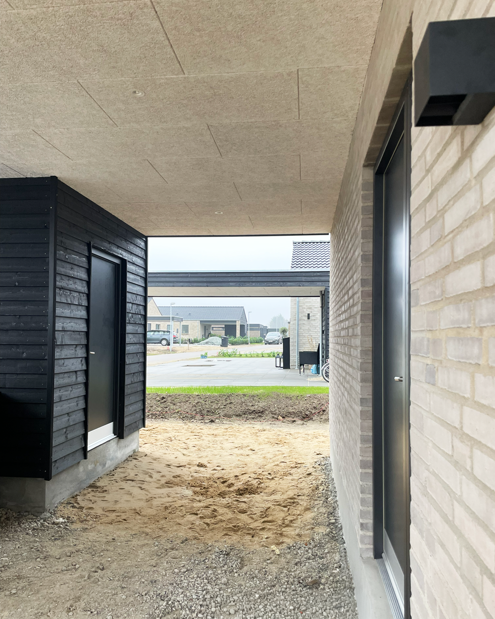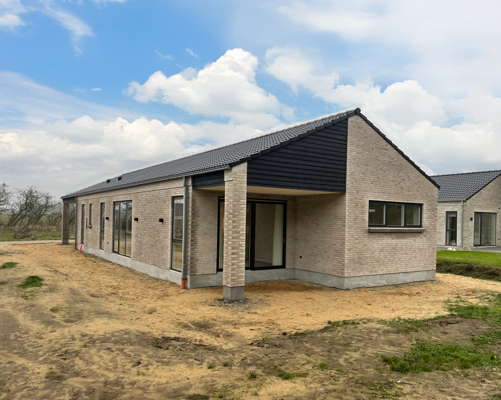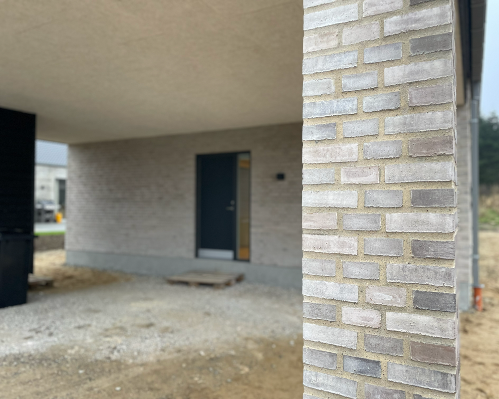 Vi har afleveret et 160 m² længehus til Laura og Andreas på Brendmosen i Funder. Huset er opført i den lysegrå mursten RT 473 Como, og den integrerede dobbelte carport fuldender facadens rolige udtryk. Inde i boligen går hvide elementer og varme egetræsoverflader igen på både badeværelser og i køkken-alrummet. Badeværelserne har flotte og særlige brusehylder, og køkken-alrummet rummer to indbyggede hvide skabsnicher samt et stort skjult viktualierum. Hjemmet afrundes med en gennemført gardinpakke med lette hvide gardiner inderst og tunge beige gardiner yderst. Køkkenet er udstyret med stålvask og Quooker.