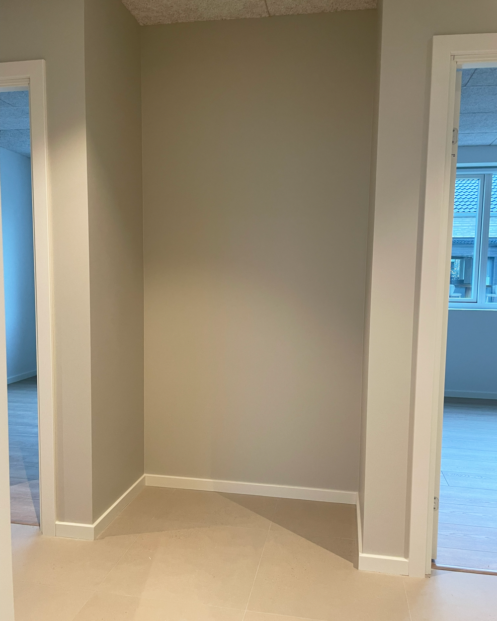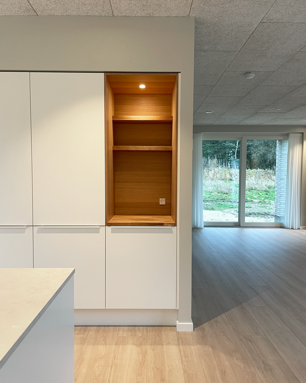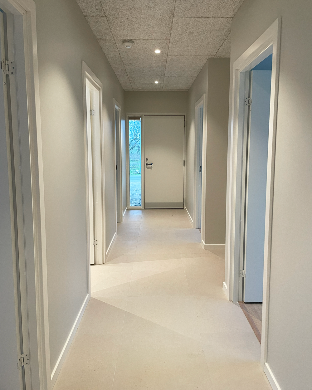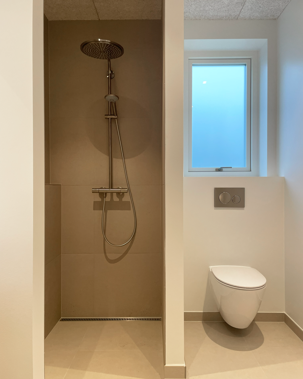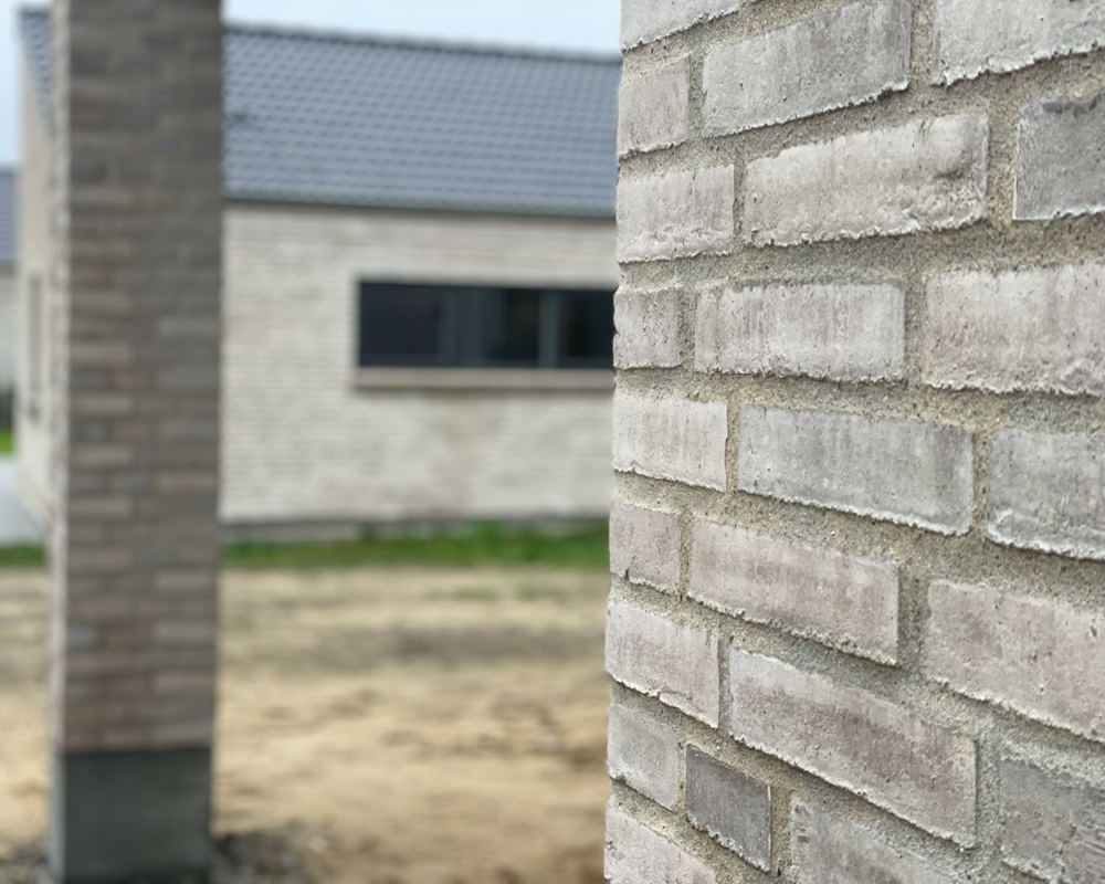 Vi har afleveret et 160 m² længehus til Laura og Andreas på Brendmosen i Funder. Huset er opført i den lysegrå mursten RT 473 Como, og den integrerede dobbelte carport fuldender facadens rolige udtryk. Inde i boligen går hvide elementer og varme egetræsoverflader igen på både badeværelser og i køkken-alrummet. Badeværelserne har flotte og særlige brusehylder, og køkken-alrummet rummer to indbyggede hvide skabsnicher samt et stort skjult viktualierum. Hjemmet afrundes med en gennemført gardinpakke med lette hvide gardiner inderst og tunge beige gardiner yderst. Køkkenet er udstyret med stålvask og Quooker.