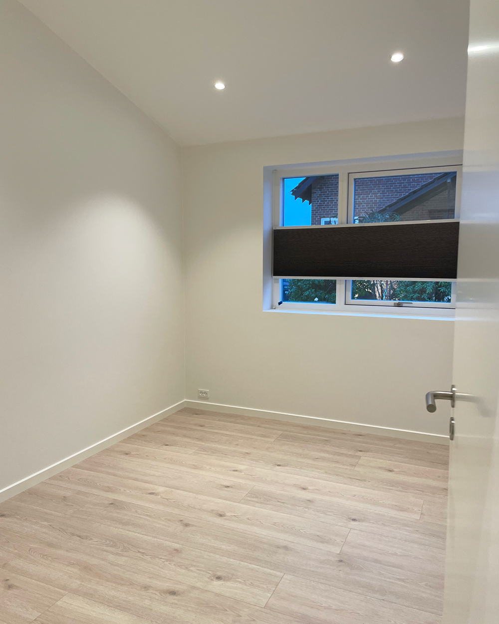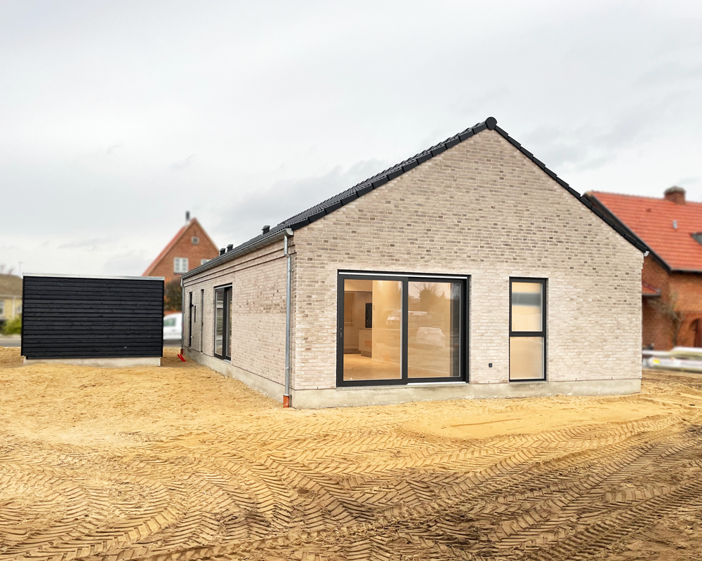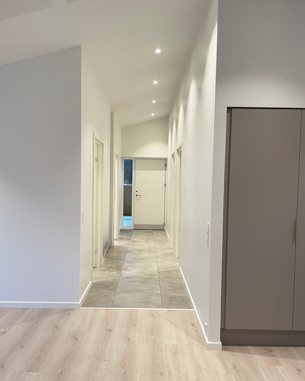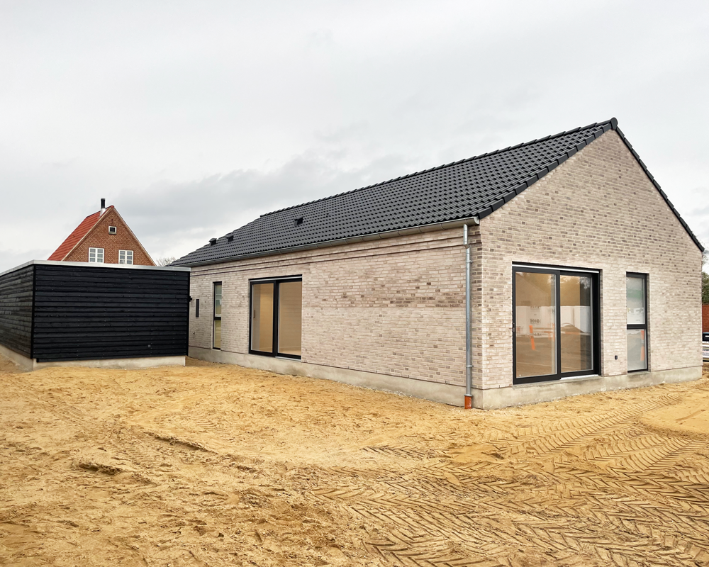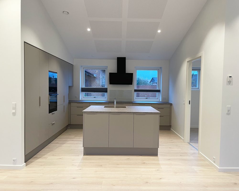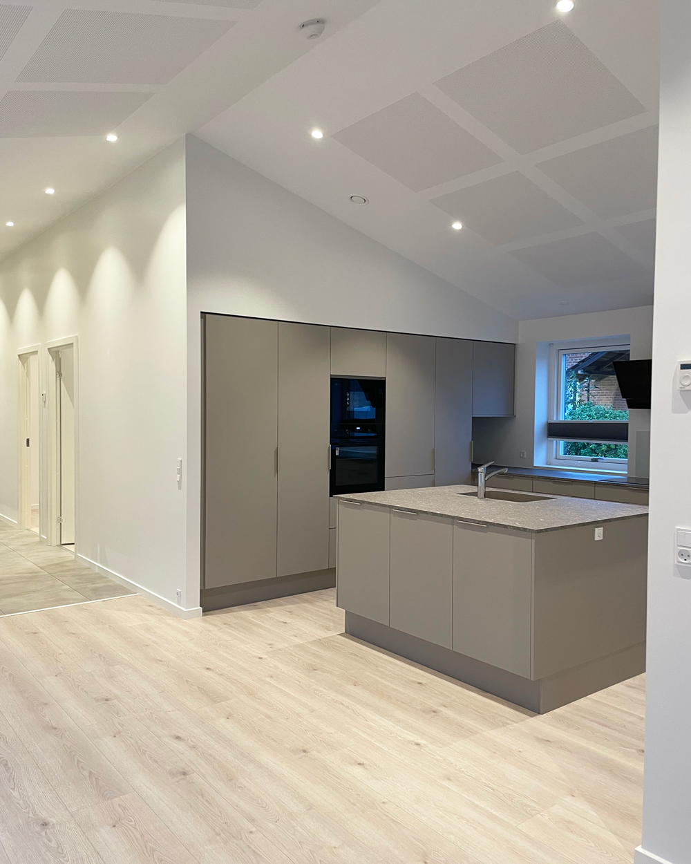 Vi har afleveret et 122 m² længehus opført i Mursten RT 473 Como fra Randers Tegl på Grøndalsvej i Silkeborg. Huset byder på loft til kip og gipslofter med akustikfelter, der giver et roligt og behageligt lydmiljø. I køkken-alrummet er der masser af skabsplads og en stor køkkenø i douce brunlige nuancer med matchende greb, som også går igen på begge badeværelser. Badeværelserne har hver sin variant af brusehylde, og en fuld gardinpakke fuldender hjemmets varme og harmoniske udtryk.