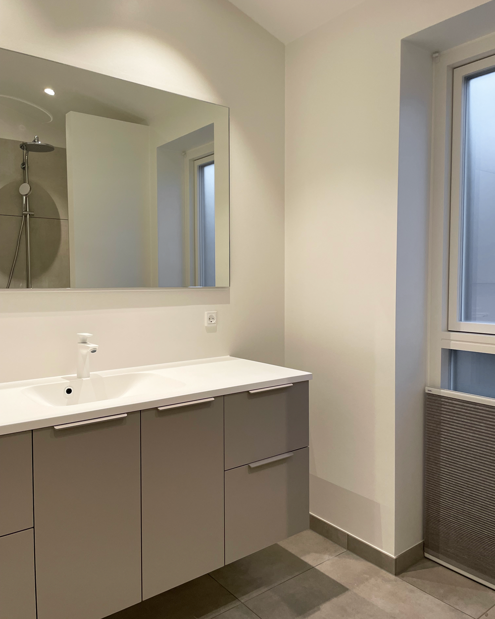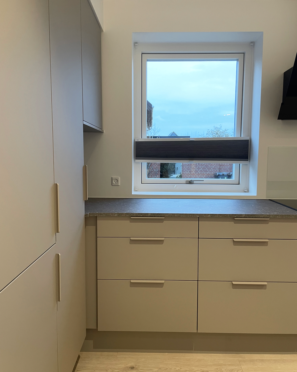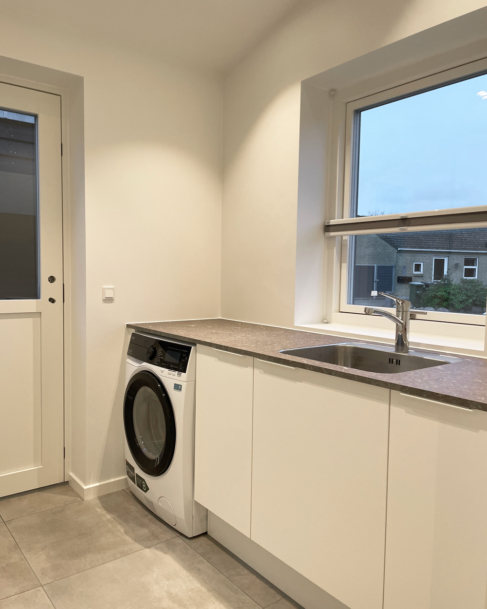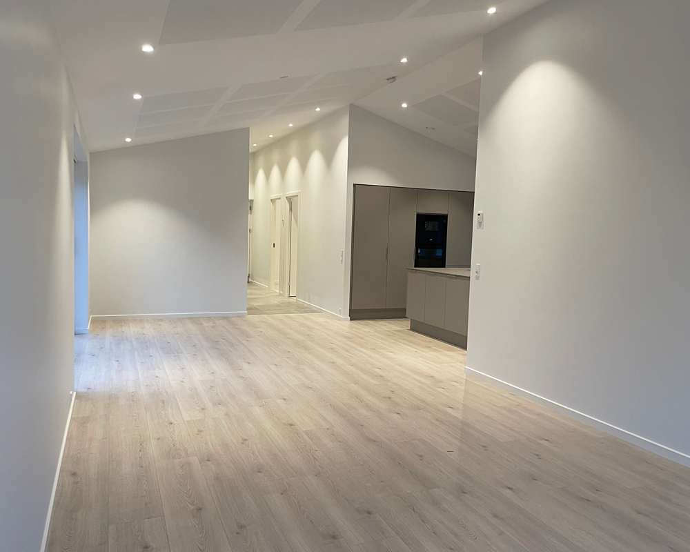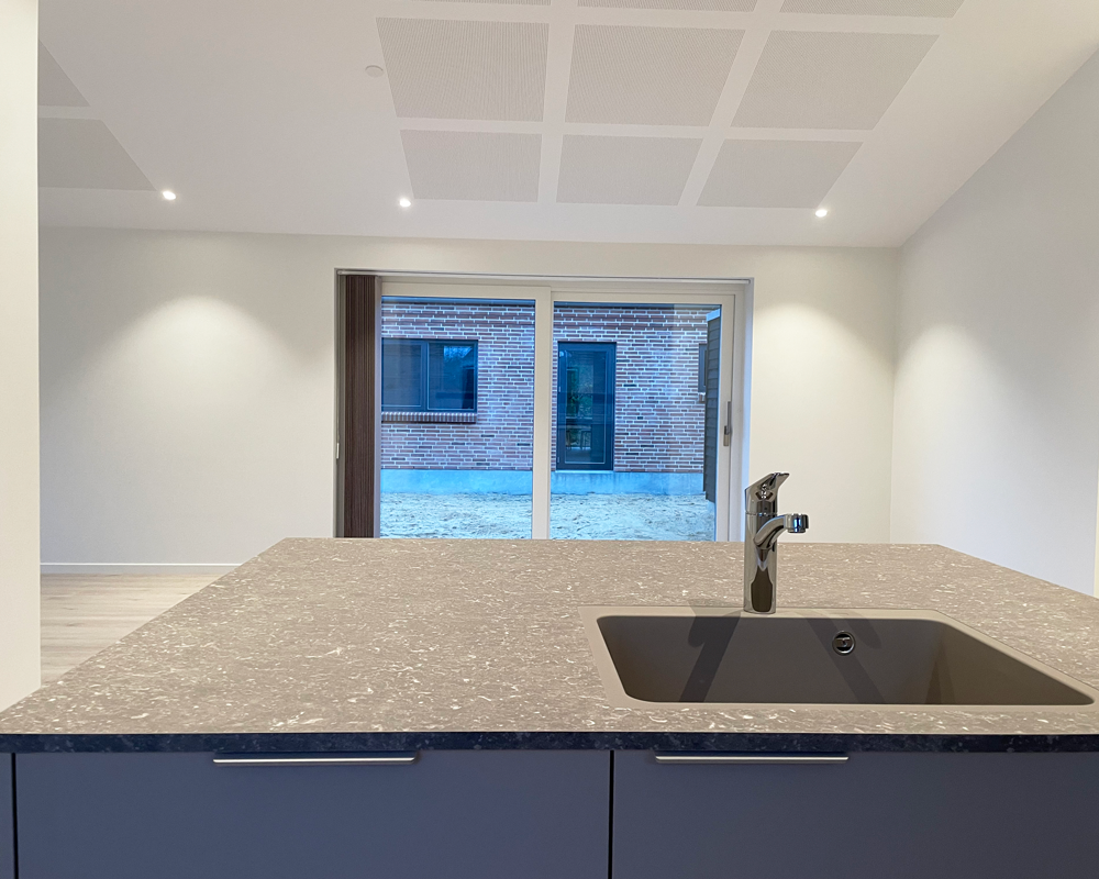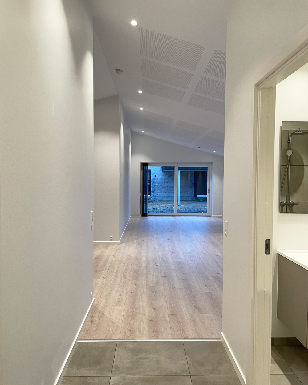 Vi har afleveret et 122 m² længehus opført i Mursten RT 473 Como fra Randers Tegl på Grøndalsvej i Silkeborg. Huset byder på loft til kip og gipslofter med akustikfelter, der giver et roligt og behageligt lydmiljø. I køkken-alrummet er der masser af skabsplads og en stor køkkenø i douce brunlige nuancer med matchende greb, som også går igen på begge badeværelser. Badeværelserne har hver sin variant af brusehylde, og en fuld gardinpakke fuldender hjemmets varme og harmoniske udtryk.