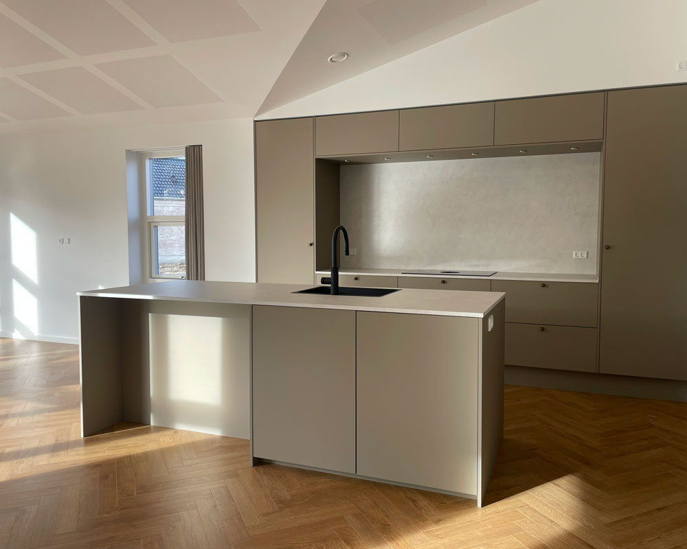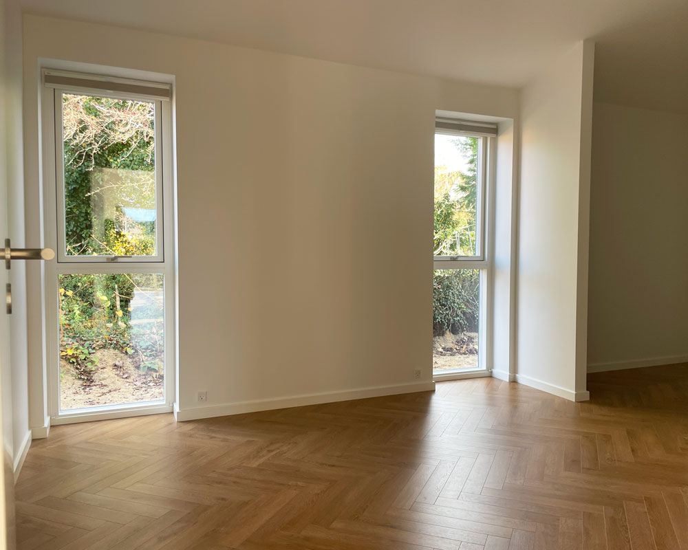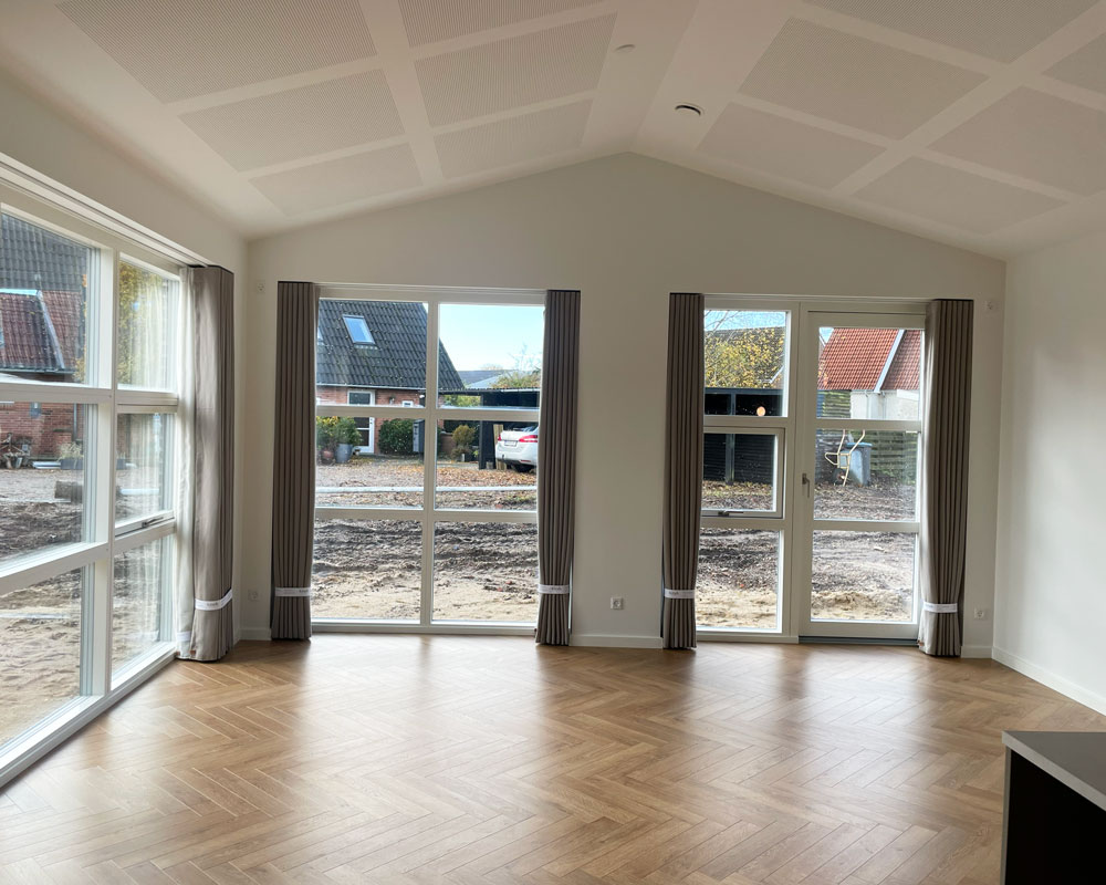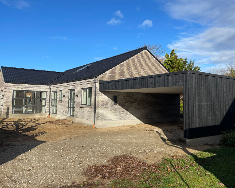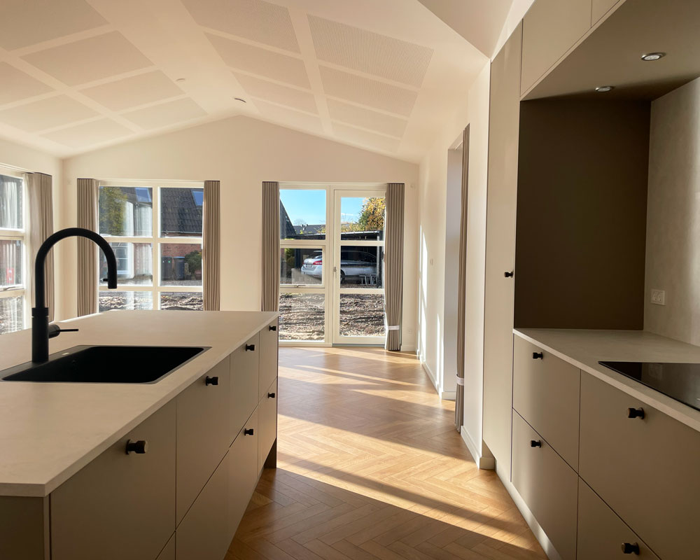 Vi har afleveret et 140 m² vinkelhus til Simon og Mette i Gustavsgade, Alderslyst. Huset byder på sildebensgulv gennem de centrale rum, beige mosaikklinker i entre, bryggers og badeværelser samt loft til kip med akustikfelter. Begge badeværelser har retro klinker i brusenichen med indbyggede hylder. Derudover rummer huset walk-in, indbygget kontorniché og en hyggelig alkove i gangarealet. Køkken-alrummet er stort og åbent med vinkøleskab, skjult depotrum og en bar-stemning skabt af indbygget vinglasholder. Udenfor er der etableret dobbelt carport.