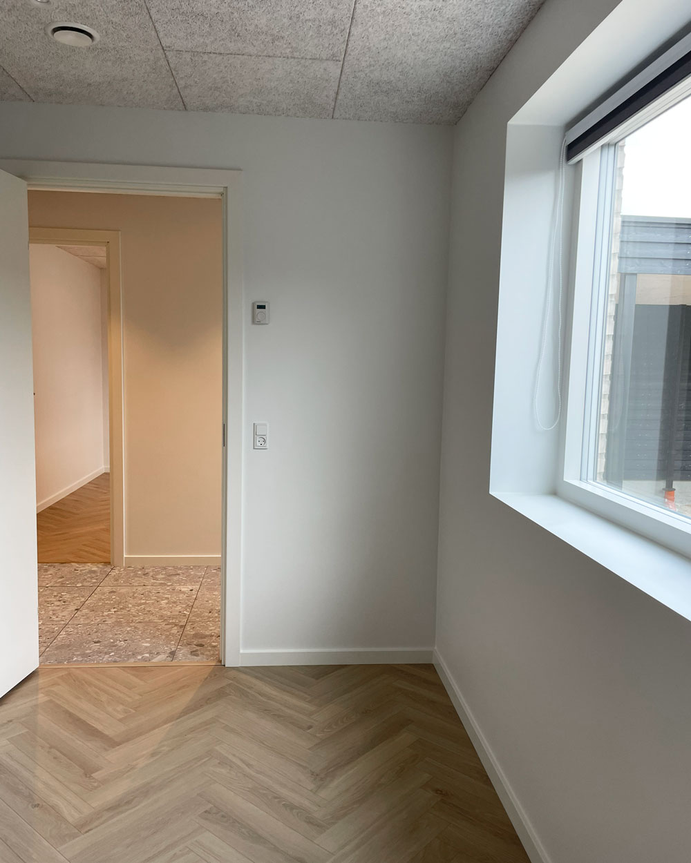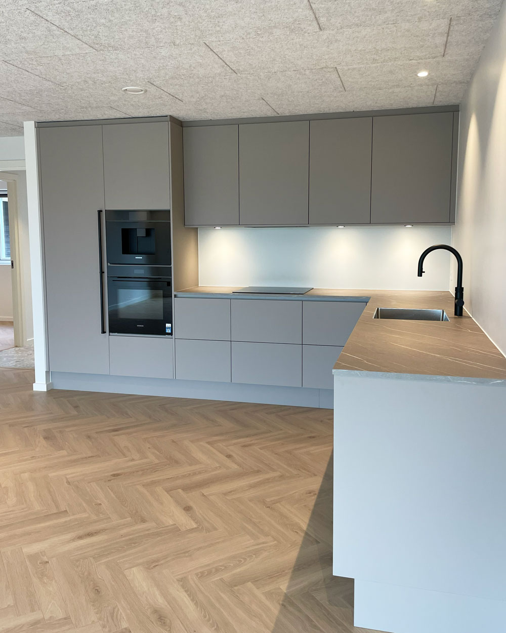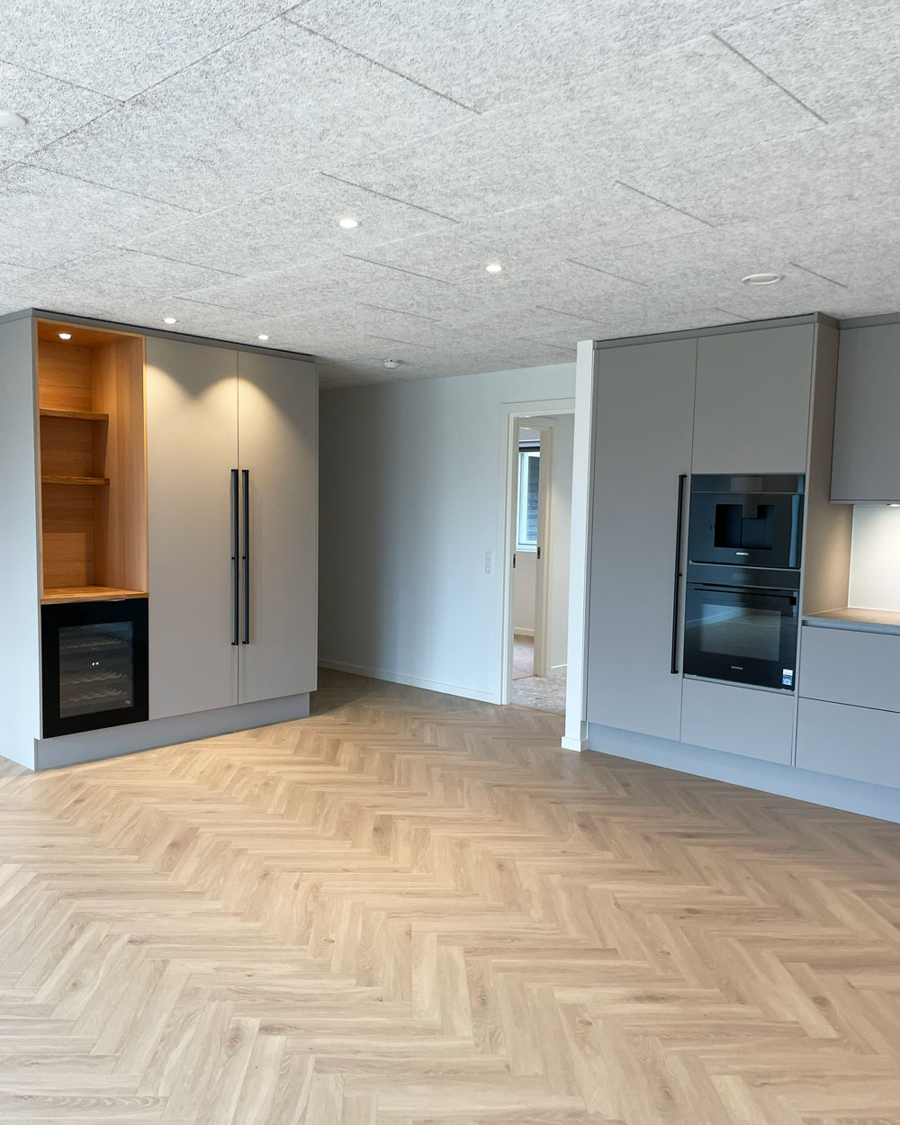 Vi har afleveret et stilfuldt rækkehus på 108 m² til Louise og Hagbart i Trindagerparken. Hjemmet rummer smukke detaljer: sildebensgulv, indbygget garderobeskab i entreen og mosaikklinker i grålige nuancer på gulve i entre og bad. Køkkenet fra Svane er holdt i varme gråbeige toner med push-funktion, vinkøleskab og indbygget kaffemaskine – perfekt til både hverdagskaffe og hyggelige aftener. Et moderne og harmonisk hjem, hvor funktionalitet og æstetik går hånd i hånd.