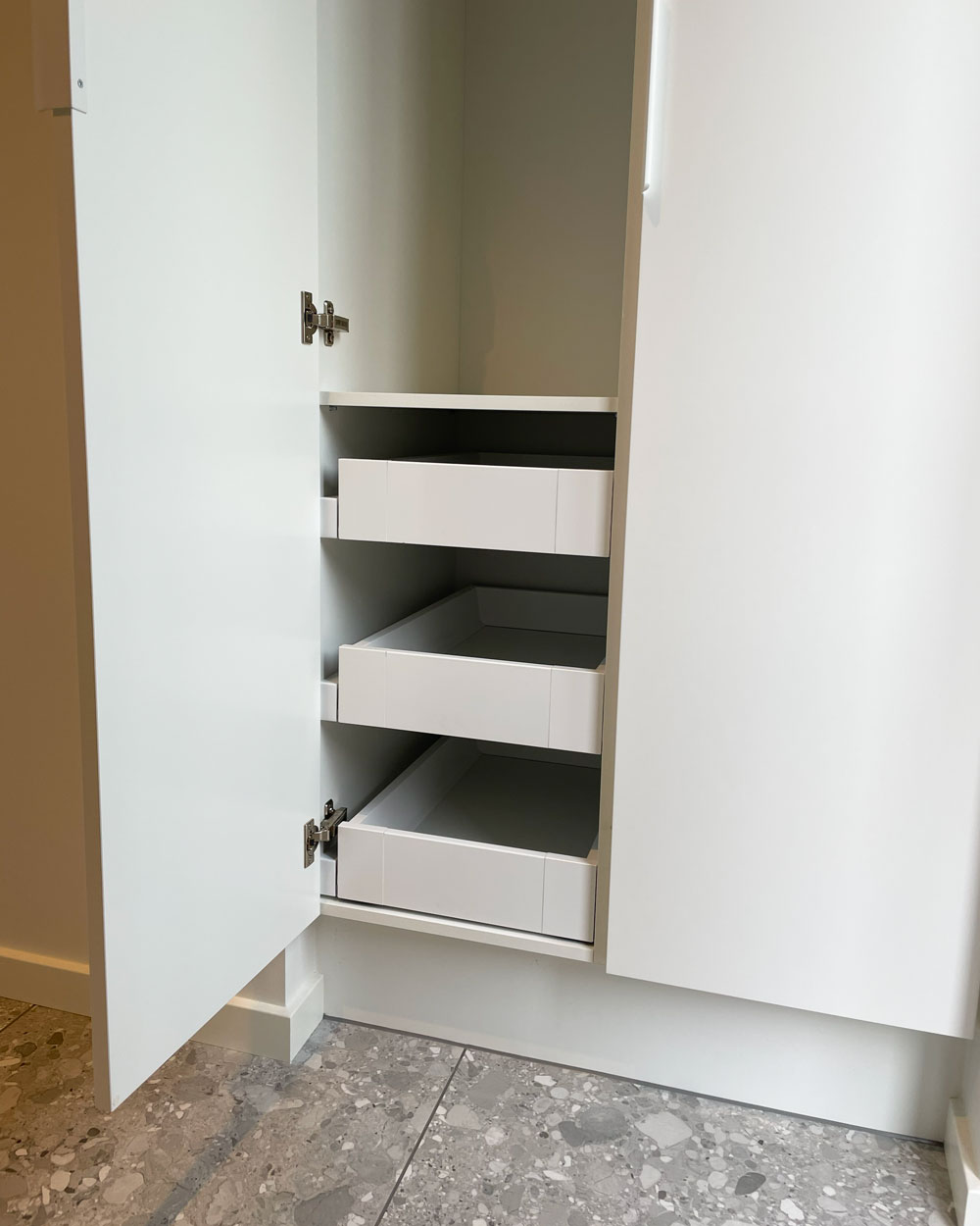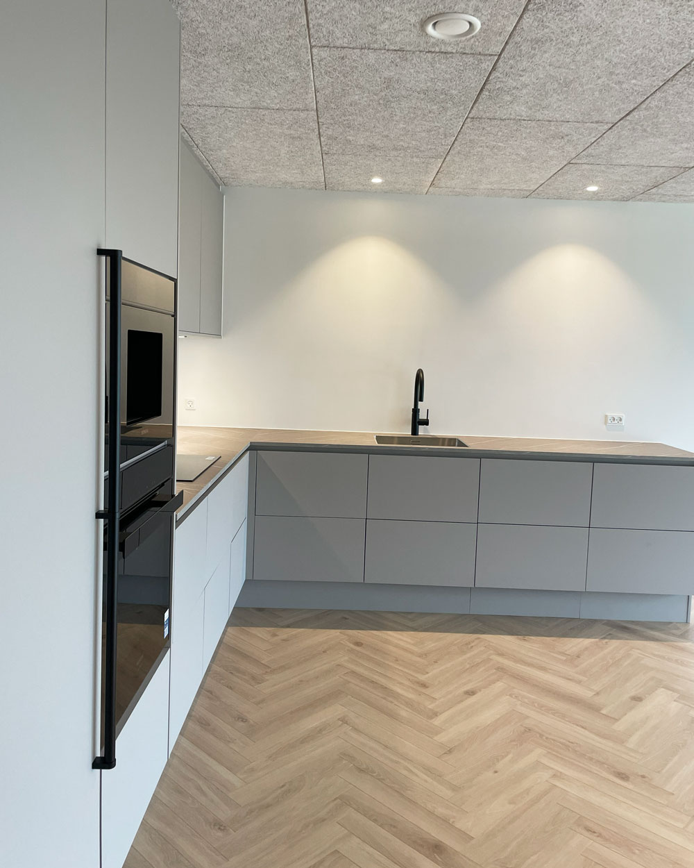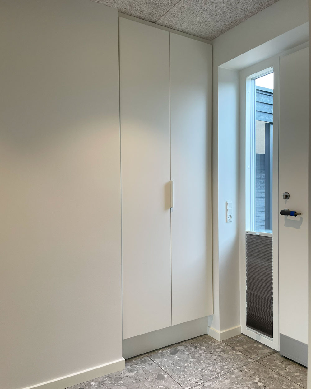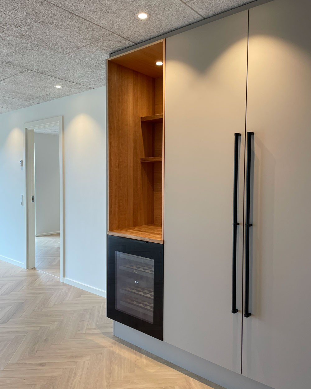 Vi har afleveret et stilfuldt rækkehus på 108 m² til Louise og Hagbart i Trindagerparken. Hjemmet rummer smukke detaljer: sildebensgulv, indbygget garderobeskab i entreen og mosaikklinker i grålige nuancer på gulve i entre og bad. Køkkenet fra Svane er holdt i varme gråbeige toner med push-funktion, vinkøleskab og indbygget kaffemaskine – perfekt til både hverdagskaffe og hyggelige aftener. Et moderne og harmonisk hjem, hvor funktionalitet og æstetik går hånd i hånd.
